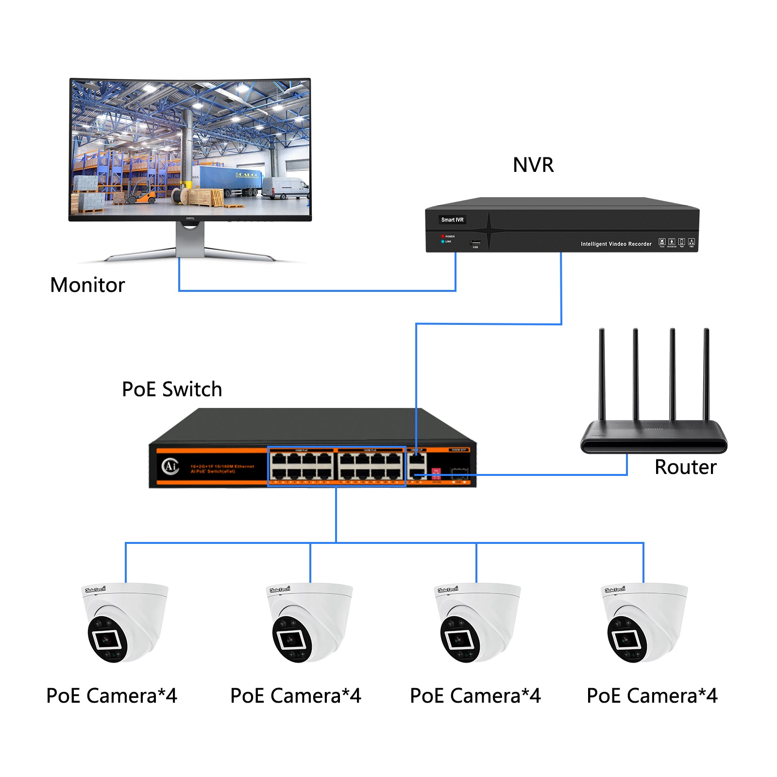 4. Camera built-in Power over Ethernet POE: 48V-52V (IEEE 802.3af standard), 16-port PoE switch, 10/100Mbps+2 LAN 100/1000Mbps+1 SFP 100/1000M, PoE extension 250m, 300W power supply