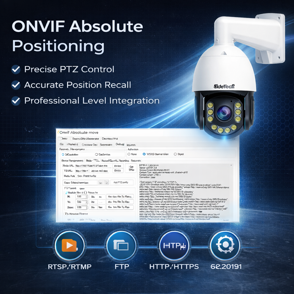 | Absolute Positioning | Support ONVIF and Onvif Absolute move, RTSP, RTMP, Hikvision protocol, Absolute Positioning | ||